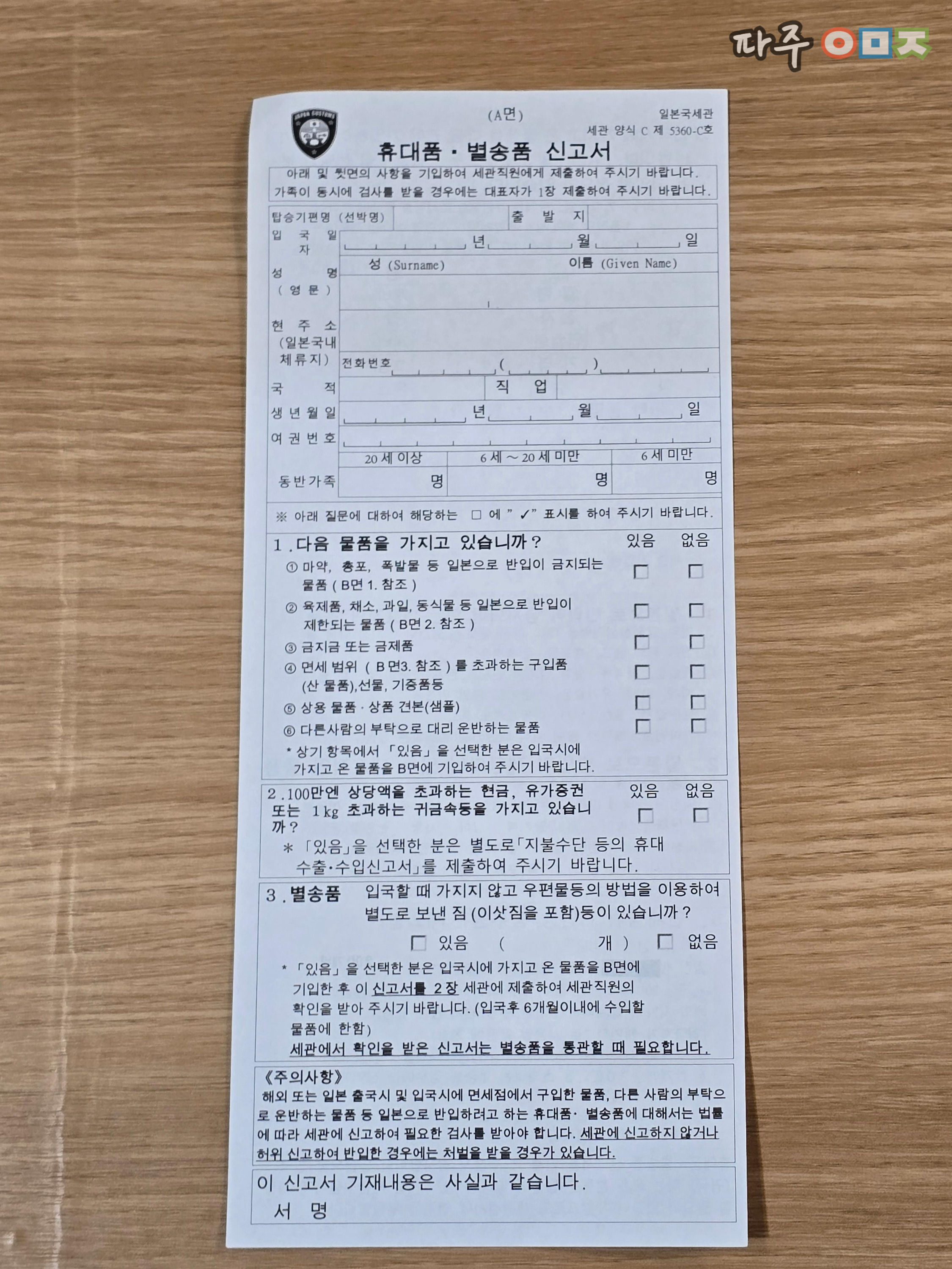 6) 대마도 입국신고서 및 세관신고서 작성
